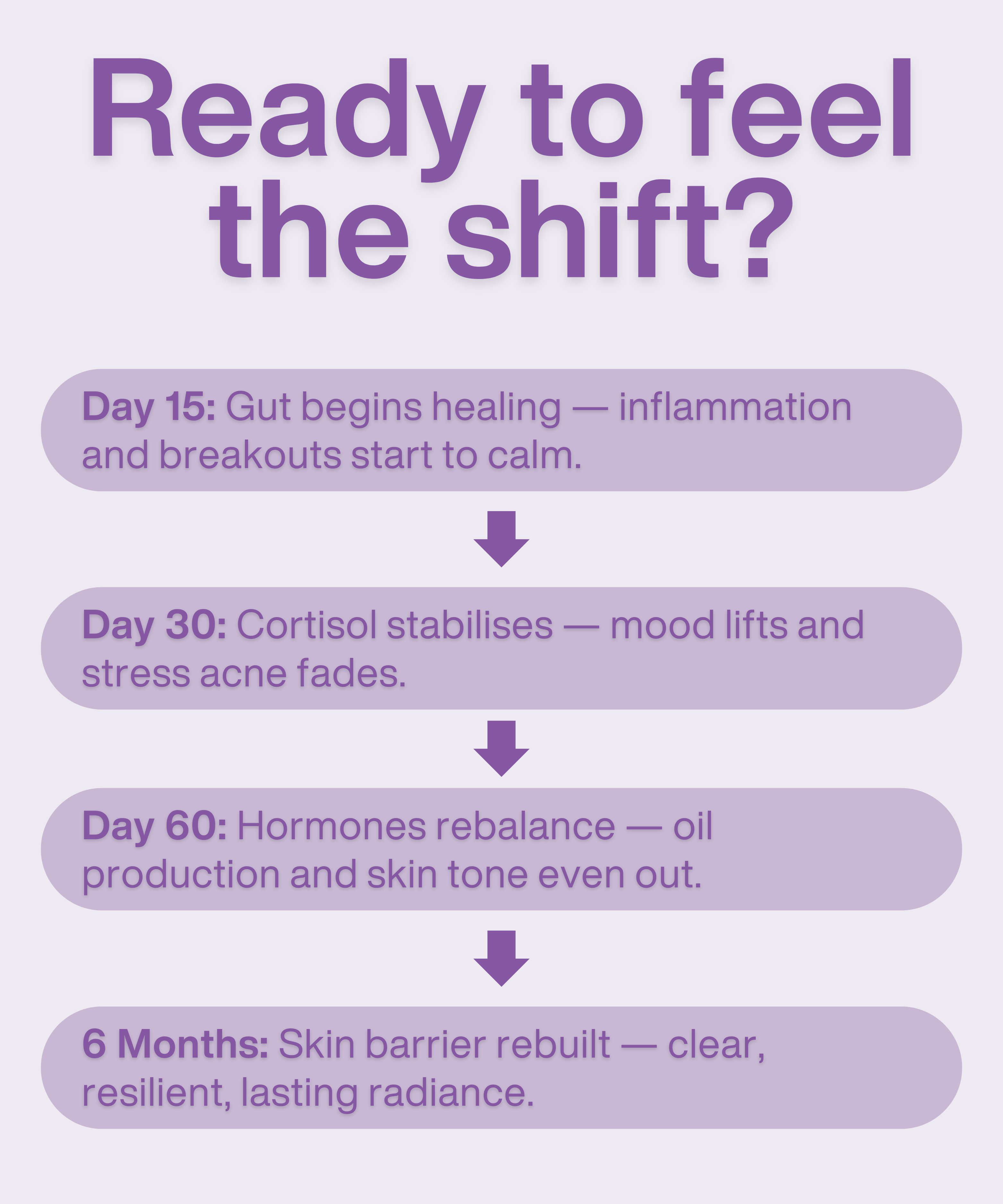 Most people notice changes within the first 2–3 weeks — calmer skin, better digestion, and more stable energy. Results continue to build as your gut lining and skin barrier repair from within.